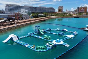 海に大きな浮き具(滑り台、トランポリン、バランスボール、ロープ渡りなど)を浮かべ、文字通り海のアスレチックとして楽しめます。