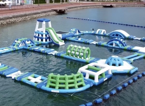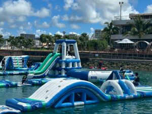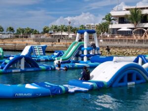 海に大きな浮き具(滑り台、トランポリン、バランスボール、ロープ渡りなど)を浮かべ、文字通り海のアスレチックとして楽しめます。