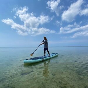 スタンドアップパドルボードの略で、サーフィンに似ていますが大きめのボードに立ちパドルで漕いで進みます。